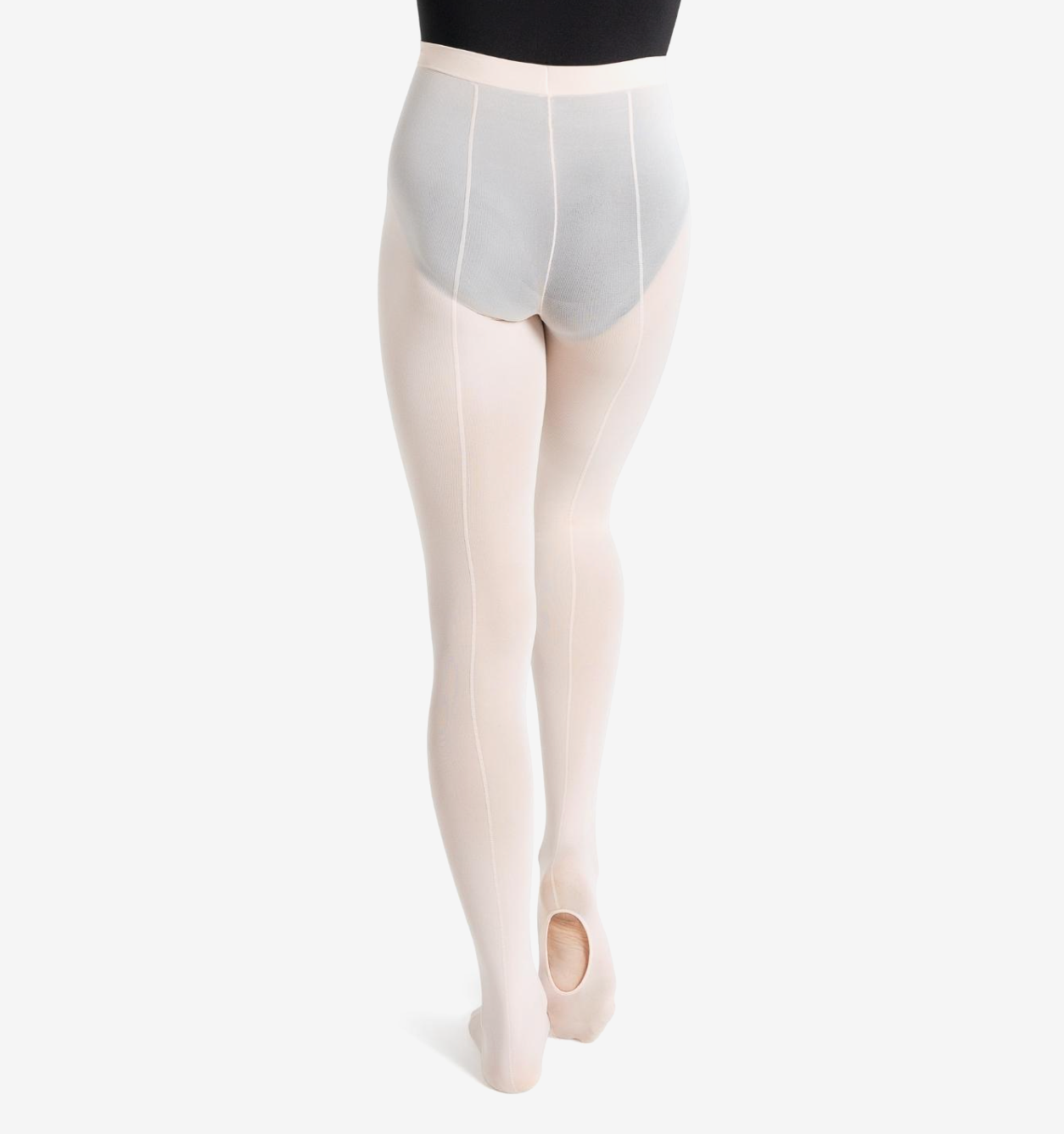 Transition tight made of Tactel® branded nylon designed to wick moisture. Self-knit waistband holds the tight securely in place without the discomfort of elastic. The transition opening offers the dancer a footed or footless tight option. Stylized back seam is perfect for ballet dancers.