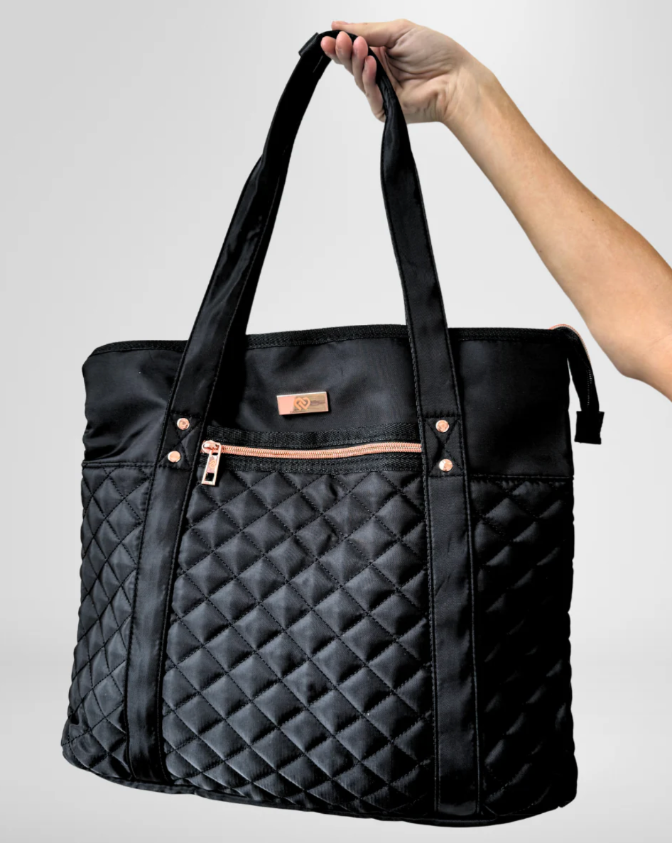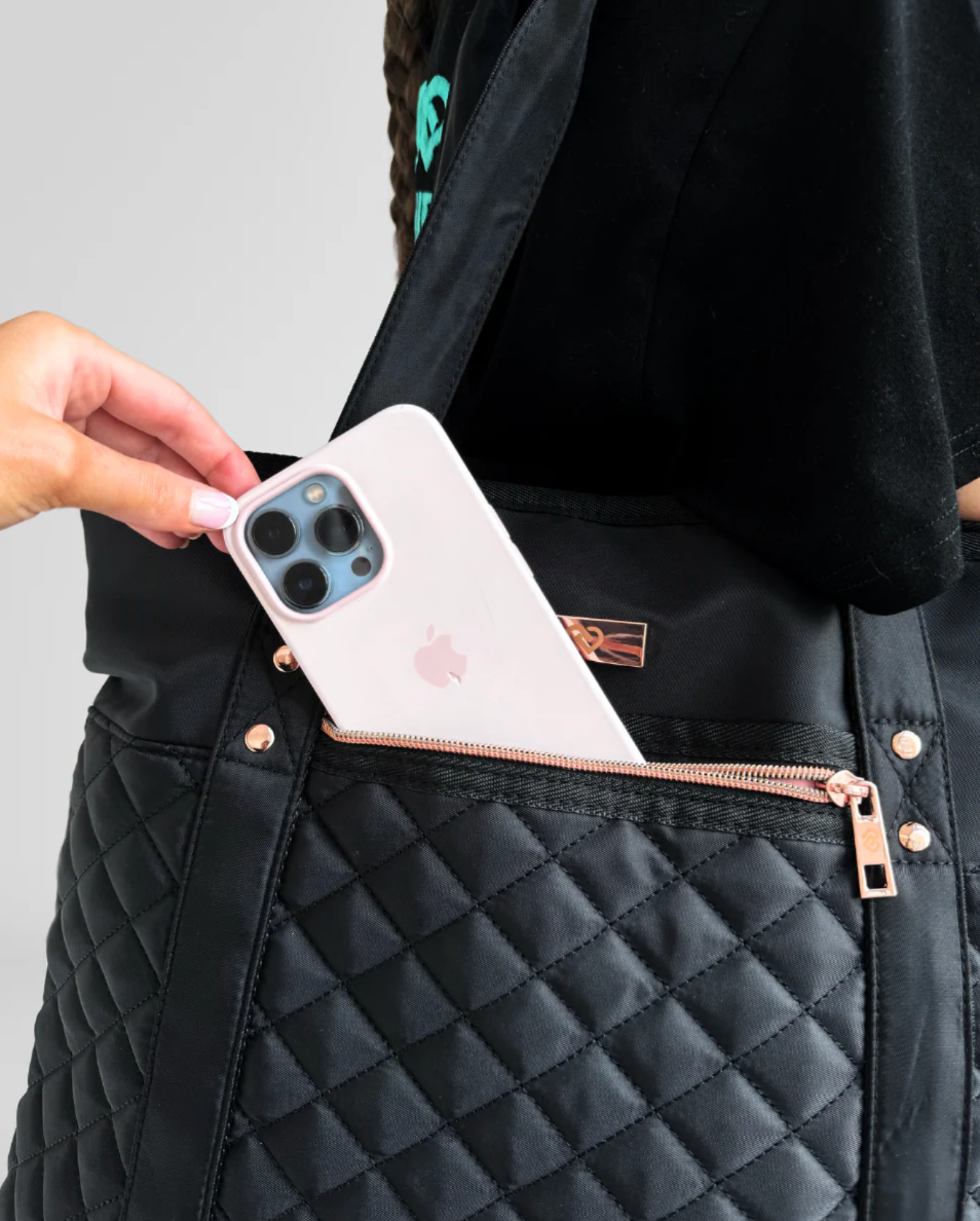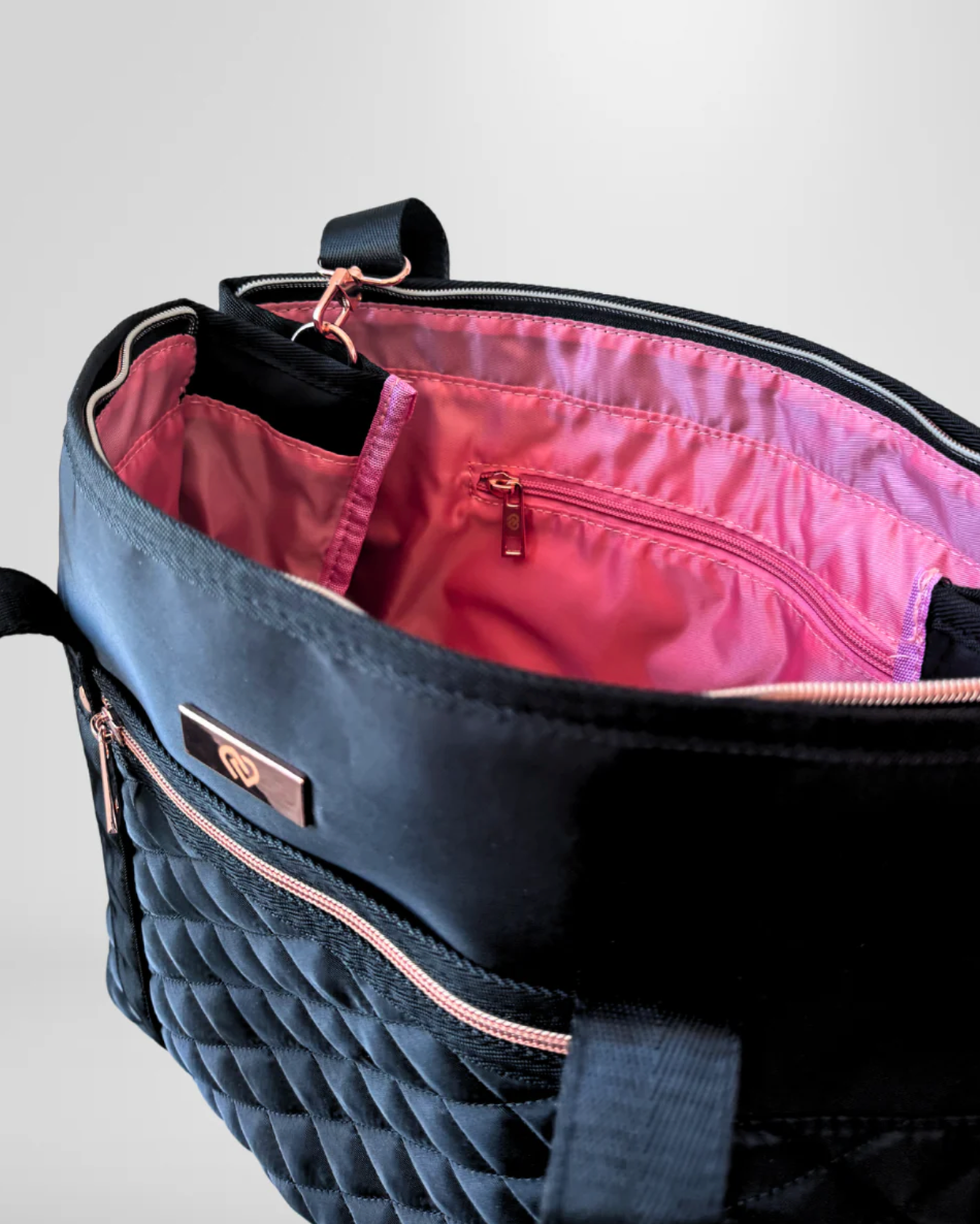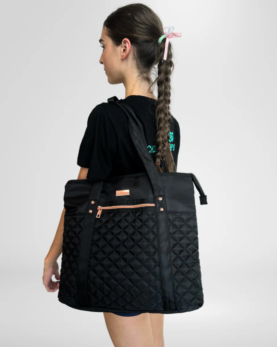 Our NEW Black Tote Bag is made from vegan fabric and is designed by dancers for dancers. The dance bag features over 10 different compartments, is completely water resistant and has a luxurious amount of storage space so you can comfortably fit all of your dancewear and dance accessories. The tote dance bag also features our signature rose gold detailing and an adjustable strap for a customisable fit.Â