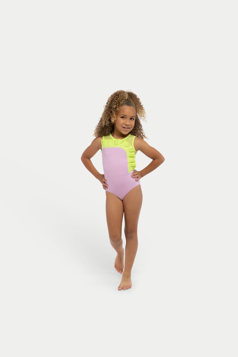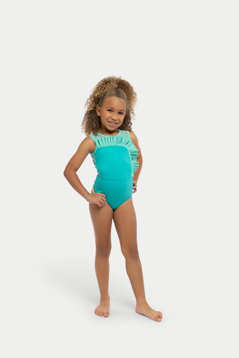 Couture-inspired dancewear? Yes, please! Our Amy leotard is a step up from your basic leotard, and she's not afraid to strut her stuff on the runway or in the dance studio. A dramatic ruffle cascades across the neckline and down one side and the details don't stop on the back, where Amy has a mesh open back. Our new ballet toile print is featured perfectly against the sky blue mesh & ruffle and we know this leotard will be a standout in your dancewear collection.
