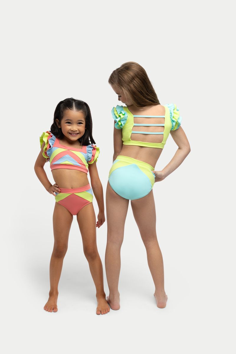 If you want to steal the show, Lauren is your set. Bright, bold color blocking paired with dramatic ruffles and a scrappy back ensure you won't go unnoticed. Hit the music, it's time to shine!