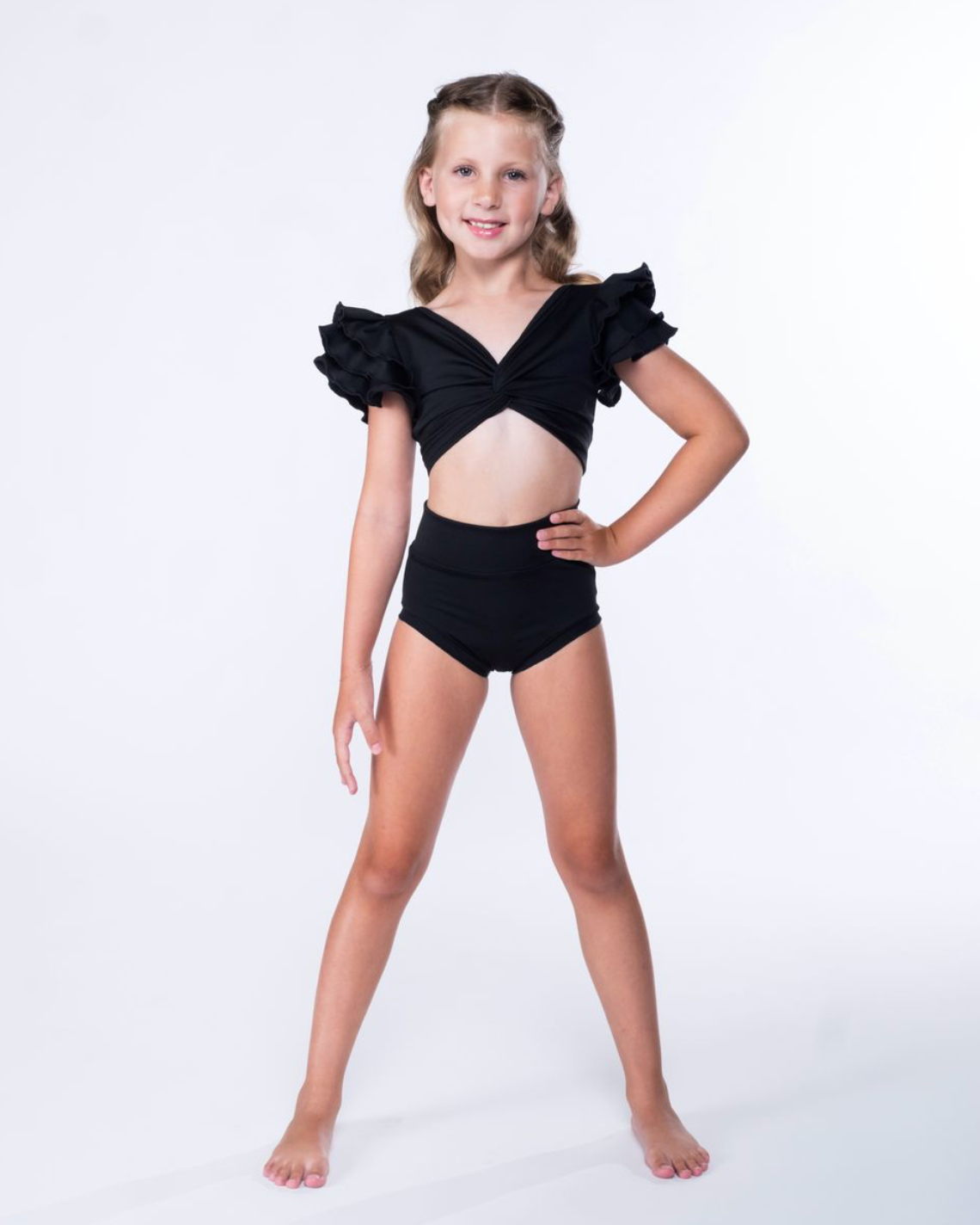 Meet Melissa! This Melissa Set is a stand-out that's perfect for classes, conventions, or the stage! Melissa has flouncy ruffled sleeves, a gathered bust detail, contrasting color waist band briefs and a scoop back with an X detail to make sure your dancer is comfortable and confident. Made out of super soft performance stretch fabric .