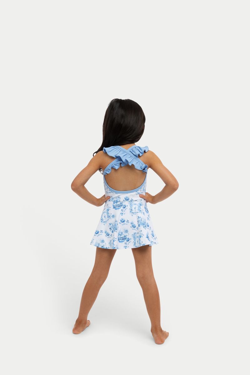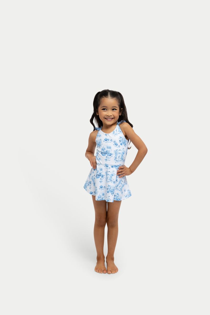 Looking for a dress you can wear to dance, pickleball, lunch, playdates & more? Palmer is your BFF! This adorable dress features a ballet toile print in sky blue, sky blue attached briefs, comfy ruffled straps & a skirt that makes twirling your newest personality trait.